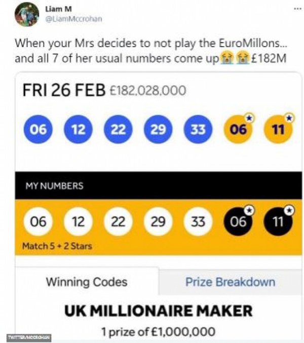 இந்நிலையில், இந்த தம்பதி எப்போதும் வழக்கம் போல் யூரோ மில்லியன் லொட்டரி டிக்கெட்டில் தங்களுடைய அதிர்ஷ்ட எண்ணாக 6, 12, 22, 29, 33, 6 மற்றும் 11-ஐ தொடர்ந்து குறிப்பிட்டு வாங்கி வந்துள்ளனர்.
