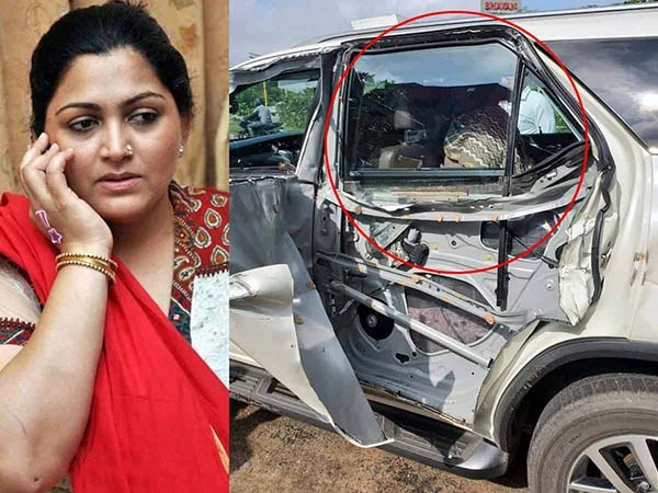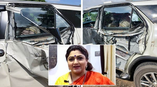 விபத்தில் குஷ்பு லேசான காயம் அடைந்துள்ளதாக தகவல் வெளியாகியுள்ளது. விபத்து குறித்து சேதமடைந்த காரின் புகைப்படத்துடன் குஷ்பு ட்விட்டரில் பதிவிட்டுள்ளார்.