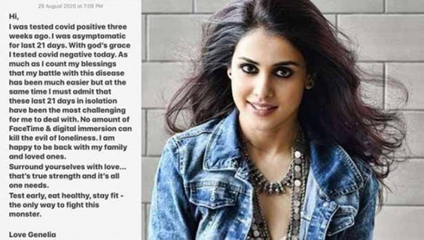 இந்திய சினிமாவின் மிக பிரபலமான நடிகையான ஜெனிலியா கொரோனாவிலிருந்து மீண்டதாக தெரிவித்துள்ளார்.
