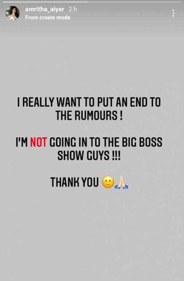 இதையடுத்து, ஏற்கனவே பிகில் படத்தில் தென்றல் கதாபாத்திரத்தில் நடித்த அமிர்தா ஐயர் பிக் பாஸில் கலந்து கொள்வதாக பல செய்திகள் வெளியானது.