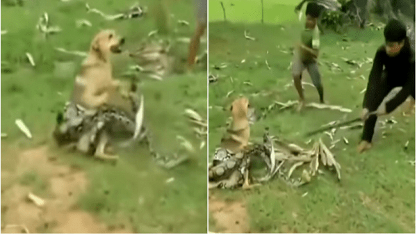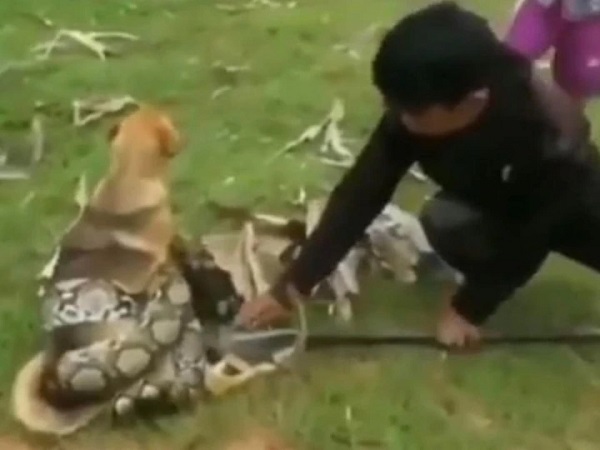 குறிப்பிட்ட அந்த வீடியோவில் மலைப்பாம்பு நாயின் பின்னங்காலை சுற்றி வளைத்து பிடித்து இறுக்குகிறது. கையில் இரும்பு தடி எடுத்து வந்த சிறுவன், மலைப்பாம்பின் தலைப்பகுதியை புல்வெளியை நோக்கி அமுக்கி பிடித்து கொள்கிறார்.
