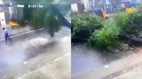 நிவர் புயல் ரு த்ரதாண்டவம்! சாலையில் நடந்து சென்றவர் மீது அப்படியே விழுந்த பெரிய மரம்… பதறவைக்கும் சிசிடிவி காட்சி!!