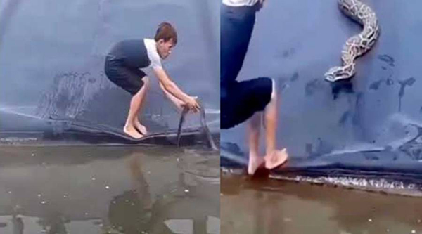 நீரிலுள்ள பாம்பை இளைஞர் ஒருவர் அதன் வாலைப் பிடித்து இழுக்கும்போது, அவருக்கு ஏற்பட்ட எதிர்பாராத திருப்பம் நிறைந்த காணொளி ஒன்று சமூக வலைதளங்களில் வைரலாகி வருகிறது.