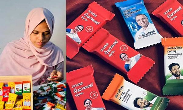 வேட்பாளர் படம் பிரசுரித்த சாக்லேட்டுகள் தயாரித்து கொடுக்கும் கேரள பெண் ஒருவருக்கு பல மாநிலங்களில் இருந்து ஓர்டர்கள் குவிந்து வருகிறது.