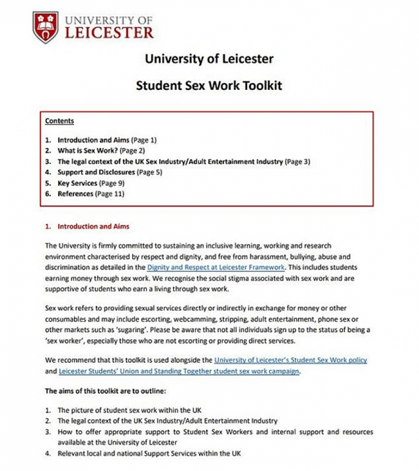 Leicester பல்கலைக்கழகம், ‘Student Sex Work Toolkit’ என்ற அதிகாரப்பூர்வ வழிகாட்டும் நெறிமுறைகளையே வெளியிட்டுள்ளது. சென்ற ஆண்டு, 3,200 மாணவிகளிடையே மேற்கொள்ளப்பட்ட ஆய்வு ஒன்றில், 4 சதவிகித மா.ணவிகள், அதாவது, 20இல் ஒரு மாணவி, கல்லூரியில் கல்விக் கட்டனம் செலுத்துவதற்காக பா.லியல் தொழில் செய்வது தெரியவந்துள்ளது.