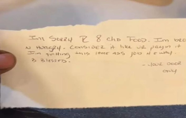 நான் உங்கள் உணவை சாப்பிட்டு விட்டேன். நான் மிகவும் பசியில் இருந்தேன். எனக்காக நீங்கள் பணம் செலுத்தியதாக கருதி கொள்ளுங்கள். இந்த வேலையை நான் விடப் போகிறேன்” என அந்த கடிதத்தில் டெலிவரி ஊழியர் குறிப்பிட்டுள்ளார்.