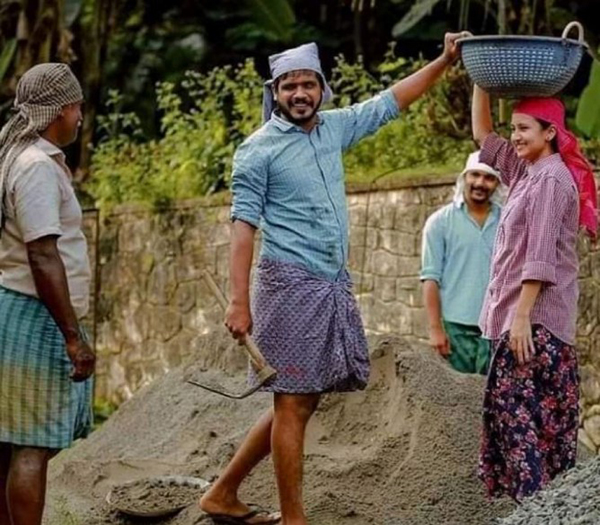 திருமண தம்பதிகள் கட்டிடம் கட்டும் கட்டுமான பணியில் ஈடுபடும் ஊழியர்களை போன்று காட்சி தருகின்றனர். இந்த போட்டோ ஷூட் சமூக ஊடகங்களில் பாராட்டையும் வரவேற்பையும் பெற்றுள்ளது.