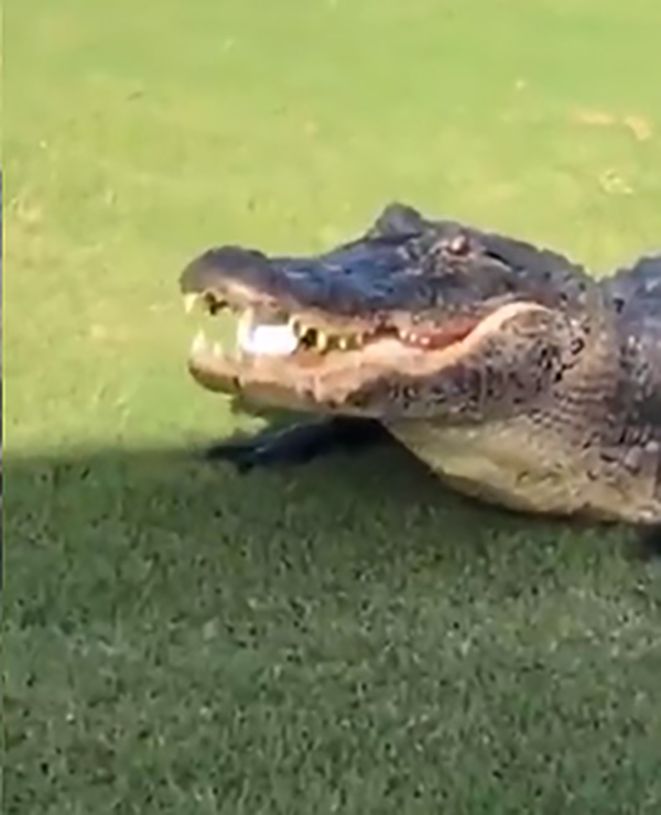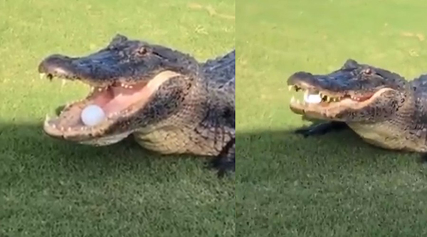 கோல்ஃப் மைதானத்தில் இருக்கும் முதலை ஒன்று குழியை நோக்கி அடித்த பந்தை டைவ் அடித்து கேட்ச் பிடிக்கிறது.