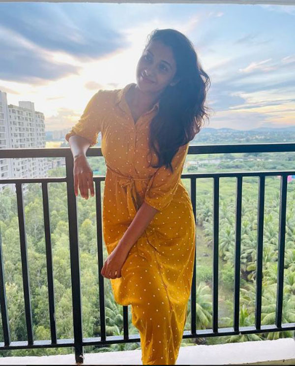 அடிக்கடி போட்டோ ஷூட் நடத்தி புகைப்படங்களை பதிவிட்டு வருகிறார். அந்த வகையில் தற்போது மஞ்ச நிற உடை அணிந்துகொண்டு தொடையை மறைத்தவாறு இழுத்து காட்டியுள்ளார்.