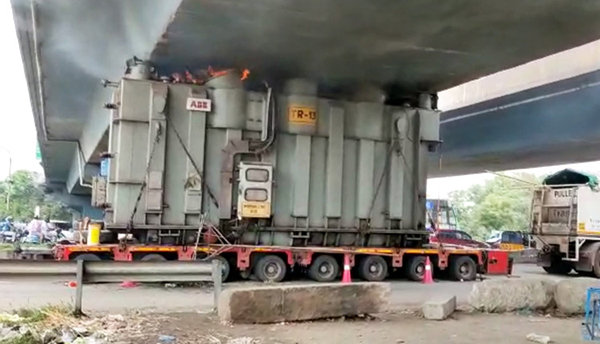 பாலத்தின் கீழ் சிக்கிய பிரம்மாண்ட மின்மாற்றி-வெல்டிங் வைக்கும்போது நடந்த சம்பவம்!!