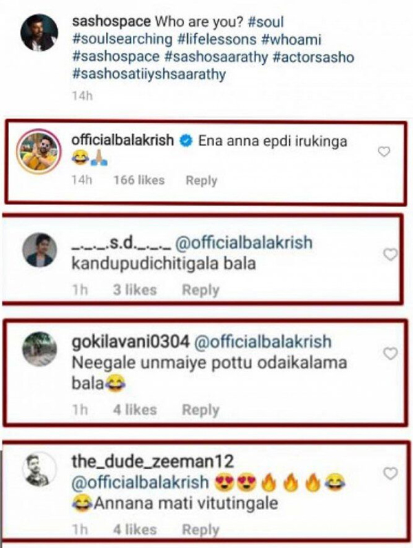 ஆம் பிக்பாஸில் இரண்டாவது இடத்தினைப் பிடித்த பாலாஜி பிக்பாஸ் குரல் கொடுப்பவர் என்ற காணொளிக்கு கீழே என்ன அண்ணா எப்படி இருக்கீங்க? என்ற கேள்வியினை எழுப்பியுள்ளார்.