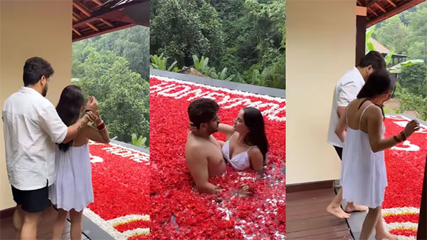 இணையத்தில் வைரலான இந்த வீடியோவில், ஒரு ஹோட்டலின் நீச்சல் குளம் அழகாக அலங்கரிக்கப்பட்டுள்ளது. அதில் மணமக்களுக்காக அழகான செய்தியும் எழுதப்பட்டுள்ளது.