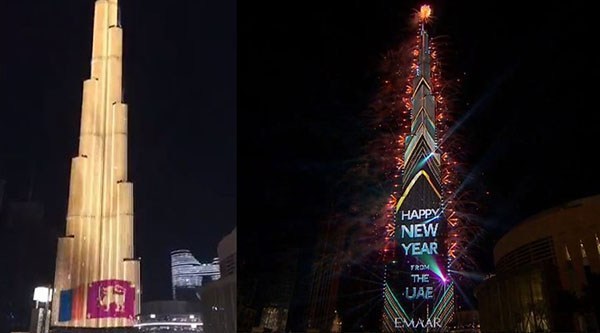 இதன்படி, ஜப்பான் மற்றும் தென் கொரியா தங்களது புத்தாண்டை இரவு 7 மணிக்கு (யு.ஏ.இ நேரம்) கொண்டாடியதால் முதலில் அந்நாட்டு கொடிகள் காட்சிப்படுத்தப்பட்டன.