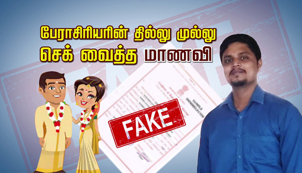 சென்னையில் கல்லூரி உதவி பே.ரா.சிரியர், தன்னிடம் பயிலும் மா ண வி க்கும், த ன க்கும் திருமணம் நடந்தது போல் போ லி யாக சான்றிதழ் தயாரித்து மா ண வியை மி.ர.ட்.டி.ய ச.ம்ப.வ.ம் அ.தி.ர்ச்.சி.க்.கு.ள்ளா.க்கியுள்ளது. 2-வது தி ரும ண த்துக்கு ஆசைப்பட்டு, சி.றை.யி.ல் க ம்பி எண்ணிக் கொ ண் டிருக்கும் உதவி பே ரா சிரியரின் அட்ராசிட்டி கு றி த்து வி வ ரிக் கிறது இந்த செய்தித் தொகுப்பு…