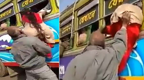 பேருந்து ஒன்றில் இடம் பிடிப்பதற்கு பெரியவர் ஒருவர் தனது மனைவியை ஜன்னல் வழியாக பேருந்திற்குள் தள்ளிவிட்டுள்ள காணொளி சிரிக்க வைத்துள்ளது.