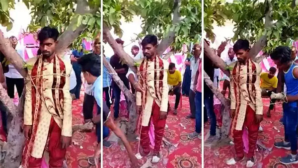 இந்நிலையில், ஆத்திரமடைந்த மணமகள் வீட்டார், தங்களிடம் வரதட்சணைக் கேட்ட மணமகனைச் சிறைப்பிடித்து மரத்தில் கட்டிவைத்தனர். இது குறித்து தகவல் அறிந்து சம்பவ இடத்திற்கு விரைந்து வந்த மந்தடா காவல் நிலைய போலீசார், மணமகனை விடுவித்து அவரைக் கைது செய்தனர்.