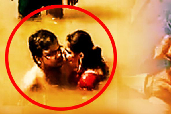 மனைவியுடன் சரயு நதியில் குளித்துக் கொண்டிருந்த நபர் பொதுவெளியில் மனைவியை முத்தமிட்டதாகத் தெரிகிறது.