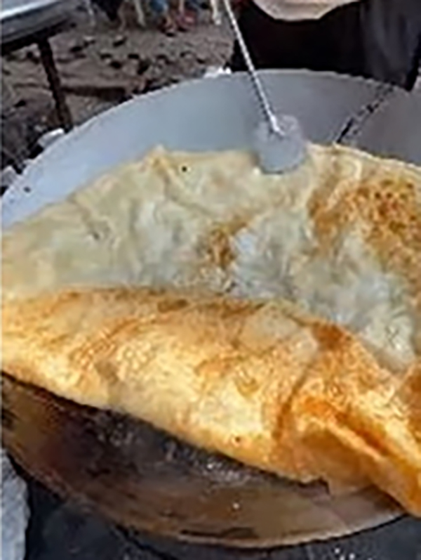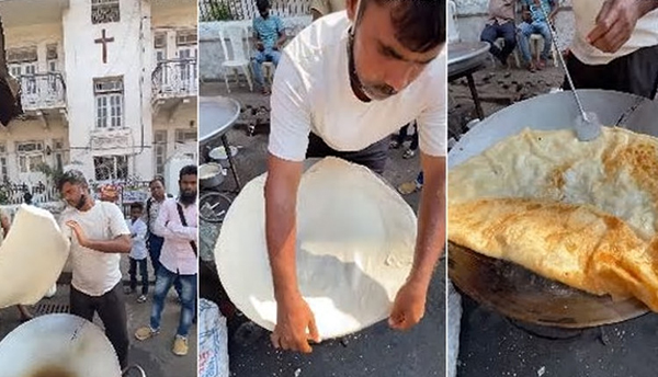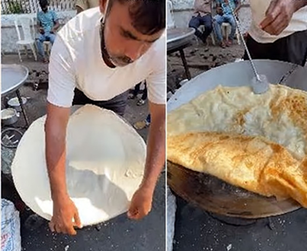 கடந்த 15 ஆண்டுகளாக அங்கு இந்த கடையை வைத்திருக்கும் நபர், முதலில் தோசைக்கல்லில் நெய்யை ஊற்றி, மைதா மாவிலான மிகப்பெரிய பரோட்டாவை கைகளால் உ.ரு.வா.க்கி அதனை ஸ்டைலாக சுற்றி தோசைக்கல்லில் போடுகிறார்.