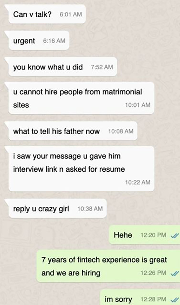 இந்நிலையில் உதிதாவின் ப்ரொபைல் பார்த்து விருப்பம் தெரிவித்து இருந்த ஒரு இளைஞரின் விபரங்களை பார்த்து விட்டு அவரை நேர்காணலுக்கு அளித்திருக்கிறார் பால். இதனை அறிந்த உதிதாவின் தந்தை “மேட்ரிமோனி மூலமாக யாரையும் வேலைக்கு எடுக்க கூடாது” என வாட்ஸாப்பில் வசை பாடியுள்ளார். இந்த வாட்சாப் உரையாடலை ஸ்க்ரீன் ஷாட் எடுத்து உதிதா தனது ட்விட்டர் பக்கத்தில் பதிவிட அது தற்போது வைரலாகி வருகிறது.