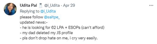 அதுமட்டுமல்லாமல் அதைத் தொடர்ந்து மற்றொரு பதிவையும் பால் எழுதியுள்ளார். அதில், அந்த இளைஞர் வருடத்திற்கு 62 லட்ச ரூபாய் ஊதியம் கேட்பதாகவும் தன்னுடைய நிறுவனத்தால் அவ்வளவு ஊதியம் கொடுக்க முடியாது எனவும் குறிப்பிட்டுள்ளார். மேலும், மேட்ரிமோனி தளத்தில் தனது ப்ரோபைலை நீக்கவும் தனது தந்தையிடம் கூறியதாக பால் குறிப்பிட்டுள்ளார்.