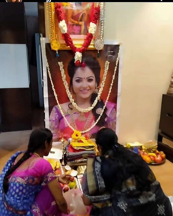 இந்தநிலையில் நடிகை சித்ரா மறைந்ததில் இருந்து அவரது புகைப்படங்கள், வீடியோக்கள் என நிறைய வெளியாகிக் கொண்டிருக்கிறது. சித்ராவிற்கு அவரது வீட்டில் பெரிய புகைப்படம் வைத்து சாமி கும்பிட்டுள்ளனர்.
