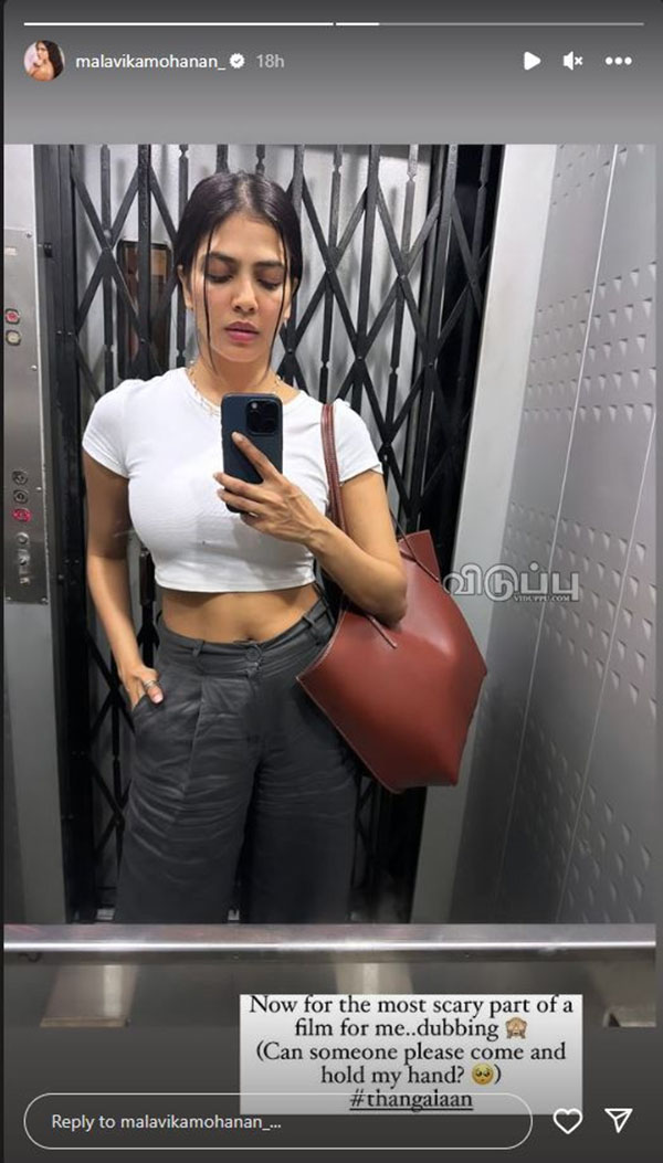 தற்போது லிஃப்ட்டில் இருந்து கொண்டு, டப்பிங் வேலைதான் எனக்கு மிகவும் பயப்படும் வேலை என்றும் யாராவது வந்து என் கையை பிடியுங்கள் என்றும் பதிவிட்டுள்ளார். தங்கலான் படத்தின் டப்பிங்கிற்காக மாளவிகா சென்றுள்ளது குறிப்பிடத்தக்கது.