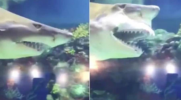ராட்சத பற்களுடன் பார்வையாளர்களை பயமுறுத்தும் சுறா மீன் வீடியோ இணையத்தில் வைரலாகி வருகிறது.