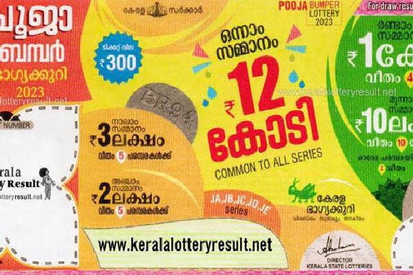 அந்தவகையில், ரூ.12 கோடி பரிசுத்தொகை கொண்ட பூஜா பம்பர் லொட்டரிகள் விற்பனை செய்யப்பட்டது. ஒரு டிக்கெட்டின் விலை ரூ.300 ஆகும். கடந்த ஒரு மாதத்திற்கும் மேல் நடைபெற்று வரும் இந்த விற்பனை அதிகரித்து வந்தது. இந்நிலையில், பூஜா பம்பர் லொட்டரி குலுக்கல் நேற்று நடைபெற்றது.