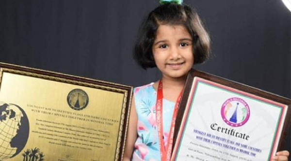 வெறும் 4.17 நிமிடத்தில் 5 வயது சிறுமி ஒருவர் 150 நாடுகளின் கொடிகள் மற்றும் தலைநகரங்களை கூறி உலக சாதனை படைத்திருக்கிறார். ம.பி., மாநிலம் உஜ்ஜைனி நகரத்தை சேர்ந்தவர் பாரத் – சங்கீதா தம்பதியினர். இவர்களுக்கு 5 வயதில் பிரஷா என்ற பெண் உள்ளார்.