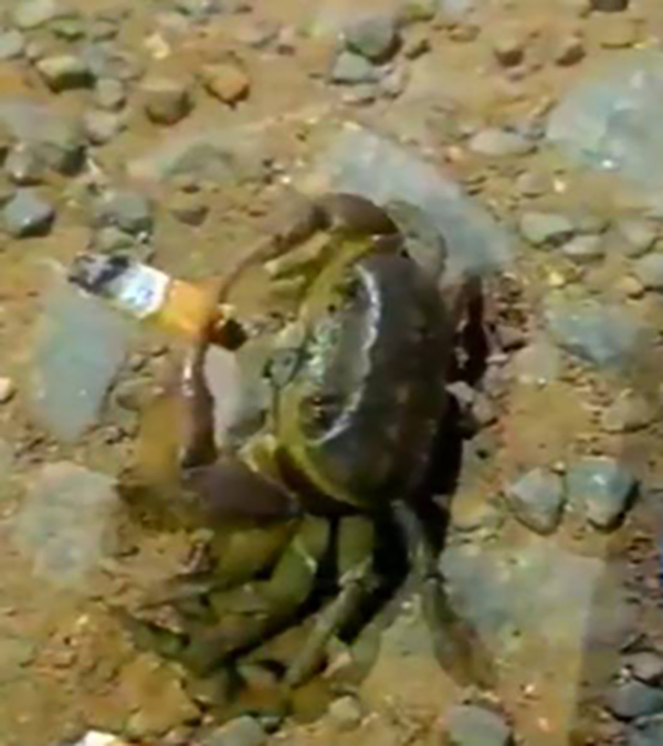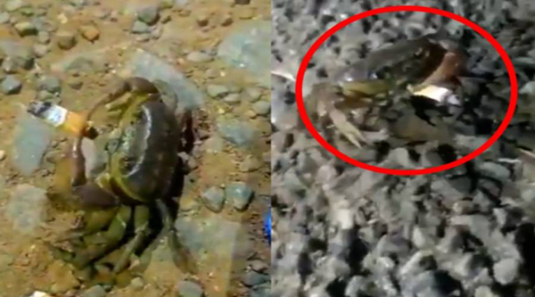 அந்த காணொளியில், கீழே கிடந்த ஒரு சிகரெட்டை எடுத்து அதை ஸ்டைலாக புகைக்கிறது அந்த நண்டு.