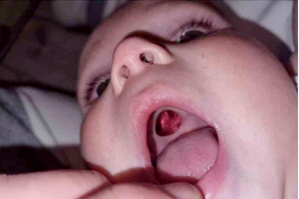 இங்கிலாந்து நகரமான Colchester-ல் வசிக்கும் 24 வயதாகும் பெக்கி ஸ்டைல்ஸ் (Becky Stiles), தனது 10 மாத குழந்தை Harvey-க்கு நேப்பியை மாற்றும் போது, குழந்தையின் வாய்க்குள் மேல் தொண்டையில் ஒரு வட்டவடிவிலான பெரிய ஓட்டையை பார்த்துள்ளார்.