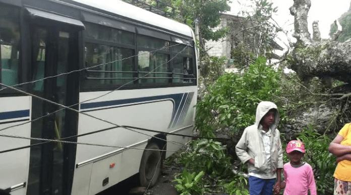 இதனால் குறித்த பகுதியில் நிறுத்திவைக்கப்பட்டிருந்த பஸ் சேதமடைந்துள்ளது. அத்துடன், இம்மரத்தின் கிளையொன்று அருகில் இருந்த மற்றுமொரு மரம்மீது விழுந்தில் அம்மரமும் சரிந்து விழுந்துள்ளது. இதனால் வீடொன்றுக்கு சேதம் ஏற்பட்டுள்ளது.