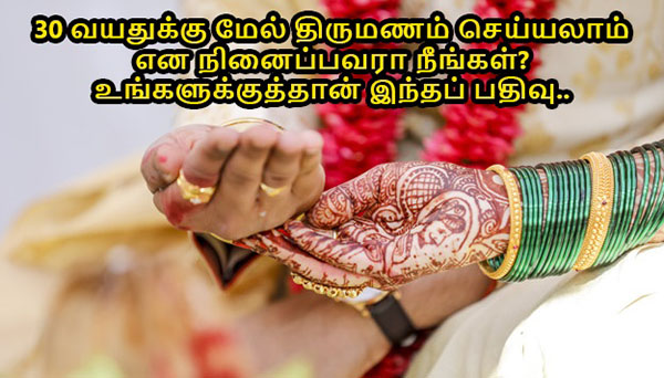 அந்த வயதைக் கடந்துபோகும் போது தான் எல்லாவிதமான பிரச்னைகளையும் சந்திக்க நேரிடுகிறது. ஆனால் இதுதெரியாமல் சிலர் 30 வயதுக்கு மேல் தான் திருமணம் செய்யவேண்டும் என லட்சியத்துடன் வாழ்கின்றனர். அவர்களுக்கான ஸ்பெசல் பதிவு தான் இது.