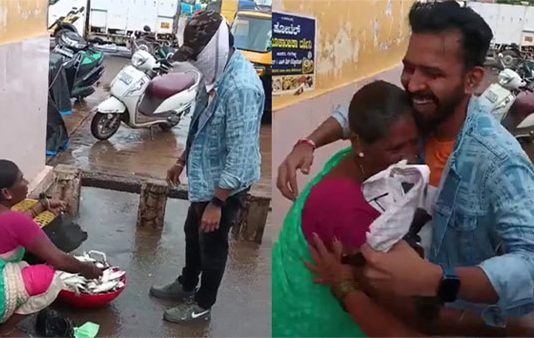 மூன்று வருடங்கள் துபாயில் வேலை பார்த்துவிட்டு இந்தியா திரும்பிய ரோஹித் என்ற இளைஞர், கர்நாடகாவின் உடுப்பி, கந்தபுரா தாலுகாவில் உள்ள கங்கோலி மார்க்கெட்டில் மீன் விற்கும் தாய்க்கு சர்ப்ரைஸ் கொடுத்தார்.