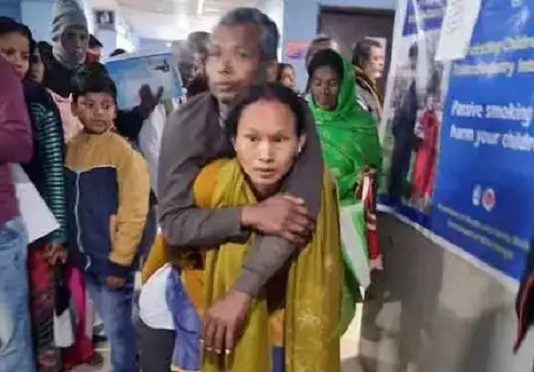 நடக்க முடியாத பரிதோஷுக்கு, வேறு வழியில்லாமல் தனது கணவரை முதுகில் சுமந்து புறநோயாளிகள்...