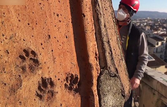 நூற்றாண்டுகள் பழமையான மேற்கூரையில் பு ன ரமைப்பு ப ணி களை மே.ற்கொ.ள்.ள கட்டுமானப் பொறியாளர்கள் மேலே சென்ற போது இந்த கால் தடங்கள் இருப்பது தெரியவந்தது.