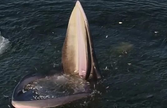 பொ.றி வைத்து பி.டி.ப்.பது போல தண்ணீரில் தனது வாய்ப்பகுதியை திறந்து வைக்கும் திமிங்கலம்,