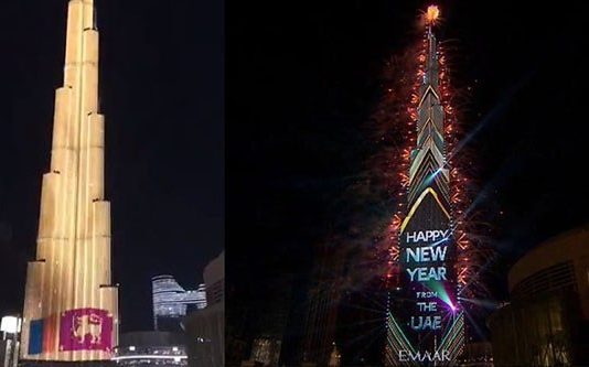 இதன்படி, ஜப்பான் மற்றும் தென் கொரியா தங்களது புத்தாண்டை இரவு 7 மணிக்கு (யு.ஏ.இ நேரம்) கொண்டாடியதால் முதலில் அந்நாட்டு கொடிகள் காட்சிப்படுத்தப்பட்டன.