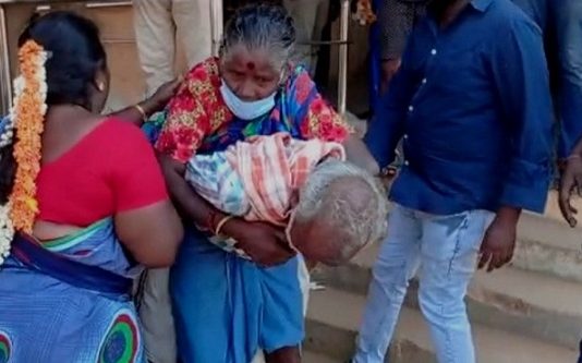கால்கள் இல்லாத மனைவியை வாக்குச்சாவடிக்கு முதுகில் சுமந்து சென்று ஓட்டு போட வைத்த முதியவர்!!