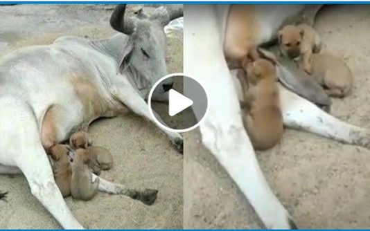 இந்நிலையில் குட்டி நாய்களுக்கு பசு தாயாக மாறி பால் கொடுத்துள்ளது.