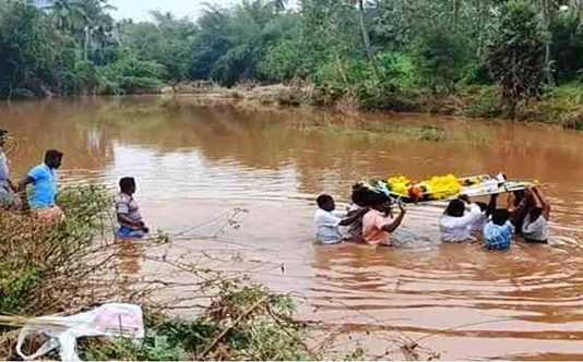இடுப்பளவு தண்ணீரில் பூ த உ ட லை ம யா னத்துக்கு எடுத்து சென்ற கிராம மக்கள்….! காரணம் என்ன தெரியுமா ??