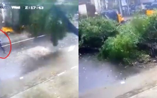 நிவர் புயல் ரு த்ரதாண்டவம்! சாலையில் நடந்து சென்றவர் மீது அப்படியே விழுந்த பெரிய மரம்… பதறவைக்கும் சிசிடிவி காட்சி!!