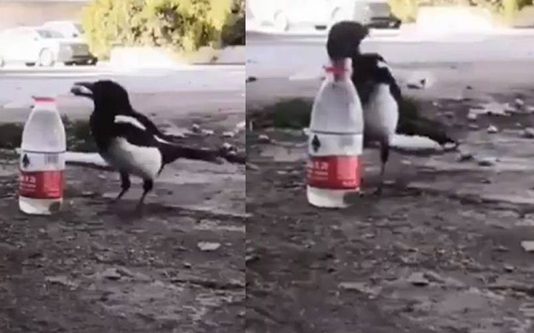 வாட்டர் பாட்டிலில் கல் போட்டு தண்ணீரை குடிக்கும் பறவை; பார்வையாளர்களை வியக்க வைத்த வைரல் வீடியோ!!