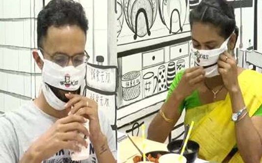 மேற்கு வங்க தலைநகரான கொல்கத்தாவில் இயங்கும் ஒரு ரெஸ்டாரண்ட்டில் உணவருந்த வரும் வாடிக்கையாளருக்கு ஜிப் வைத்த முகக்கவசம் வழங்கப்பட்டு வருகிறது.