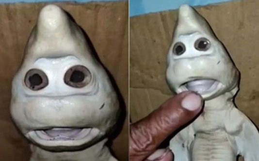 மனித உருவில் வி.கா.ர.மாக காட்சியளிக்கும் இந்த சுறாவை Abdullah Nuren (48) எனும் மீனவர் இந்தோனேசியாவின் East Nusa Tenggara மாகாணத்தில் Rote Ndao பகுதிக்கு அருகில் உள்ள கடற்பகுதியில் பிடித்துள்ளார்.