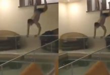 நபர் ஒருவர் உள்ளரங்க நீச்சல் குளத்தில் சூப்பர் டைவ் அடித்து சாகசம் செய்ய முயற்சி...