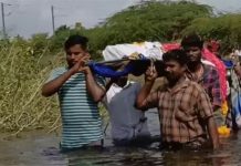 இடுப்பளவு தண்ணீரில் இறந்தவர்களின் சடலத்தை இடுகாட்டுக்கு தூக்கி செல்லும் அவலம்!!