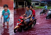 இந்தோனிஷியாவில் கிராமம் ஒன்று இரத்த சிவப்பு நிற வெள்ளத்தில் மூழ்கியிருக்கும் புடைப்படங்கள் சமூக வலைதளங்களில் வெளியாகி திகிலடைய வைத்துள்து.